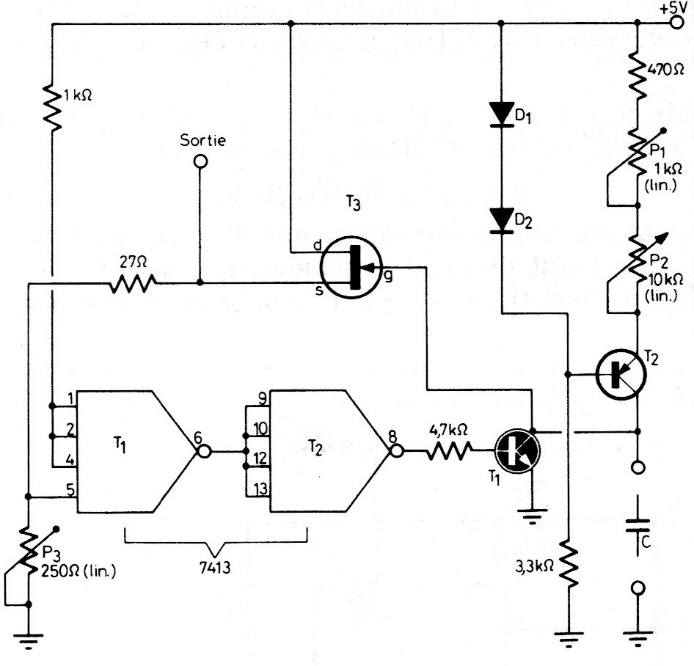 This circuit was found in an old European documentation, but it is still current due to the components it uses. The transistors can be of general use of the BC series and the circuit must be supplied with 5 V. The frequency and the linearity of the signals must be adjusted in the trimpots. The frequency range depends on C and can range from 10 Hz to 700 kHz.