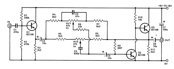 This circuit was found in documentation translated from the 1960s. The circuit can be implemented with BC549 for Q1 and BC548 for the others. The signal cables must be shielded, and the power must be removed from the amplifier with which the circuit will operate.