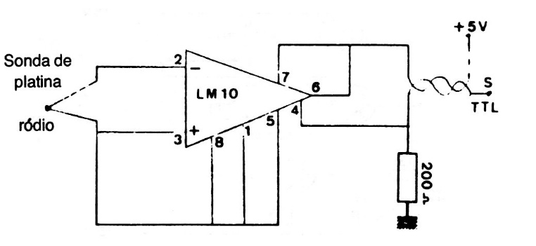 Through the TTL output this circuit can be used as a shield. The sensor is a platinum probe, and the operational amplifier can be replaced by a modern equivalent, preferably of low voltage.