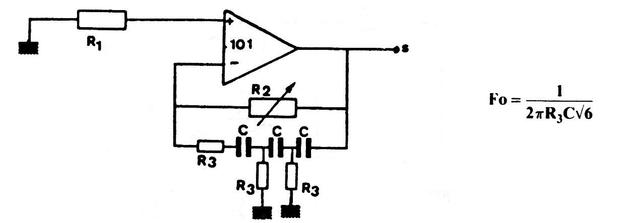 The frequency of this oscillator depends on the capacitors and typical values for the resistors are 10 k ohms. The circuit is from an old documentation and has the formula for the frequency given next to the diagram. The power supply must be symmetrical from 6 to 12 V according to the operational used.