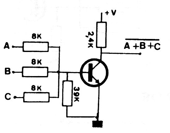 This NOR or NO-OR function circuit with a general-purpose transistor can be powered by voltages from 5 to 12 V, according to the interfacing logic. The circuit acts as a shield.