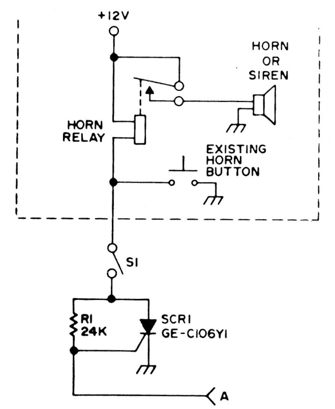 This circuit was found in a 1975 documentation. The SCR can be of any type and in this case, we have the horn activation. The relay must be a 12 V type with high contact current.