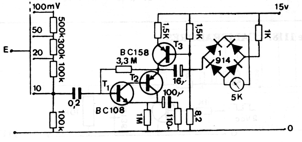This circuit was obtained in an old documentation, but it can be easily implemented with BC548 and BC558 transistors. The indicator can be an ordinary multimeter at a low range of continuous voltages. The input resistance is 10 M ohms / Volt. The supply is made with 15 V.