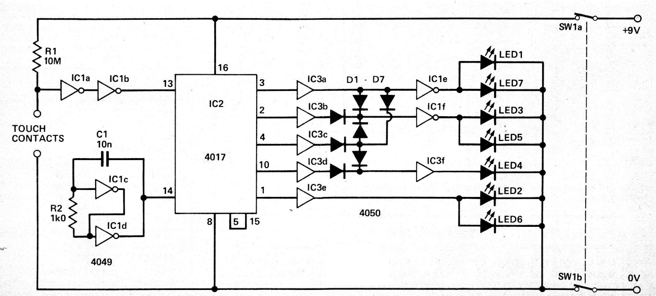 This digital die circuit was found in an old European publication. The circuit is still viable due to the components it uses, consisting not only of fun but also with its didactic aspect. The LEDs must be arranged to form the face of a die.
