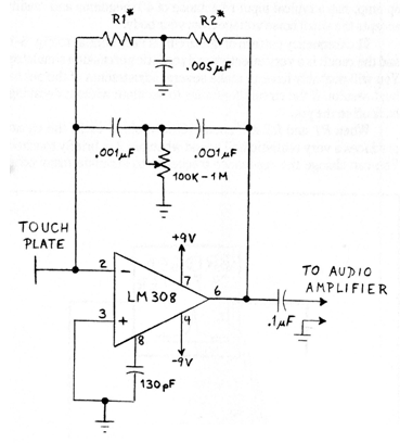 Damped oscillators can be used to produce sound from percussion instruments such as the triangle, bell, drum, etc. The circuit shown can also have the 741 in place of the original amplifier and R1 and R2 determine the sound. Their values range from 33k to 1 M, for the sounds from the highest to the lowest. The source must be symmetrical from 6 to 9 V. The circuit is from 1991 documentation.