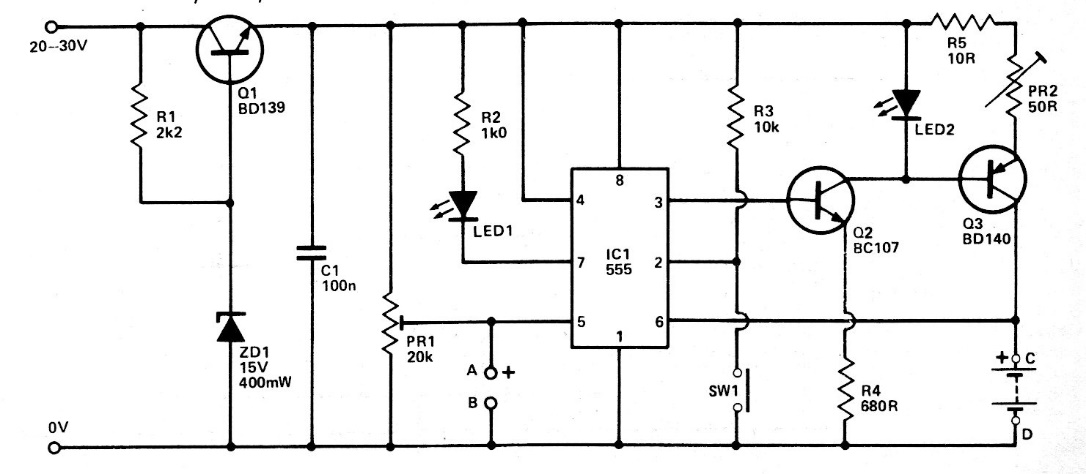 This automatic nickel-cadmium or NiCad battery charger was found in European documentation from the 1980s. The circuit is still viable and can be implemented with modern equivalent transistors. The Q1 transistor must have a small heat sink and the load current is 10 mA.