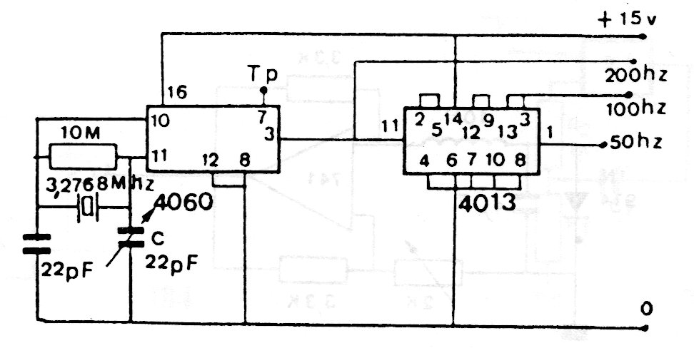 This circuit provides precise signals of three frequencies, using CMOS technology. The integrated circuits used are still common. The crystal can be obtained from old televisions and other applications that have this component at the indicated frequency.