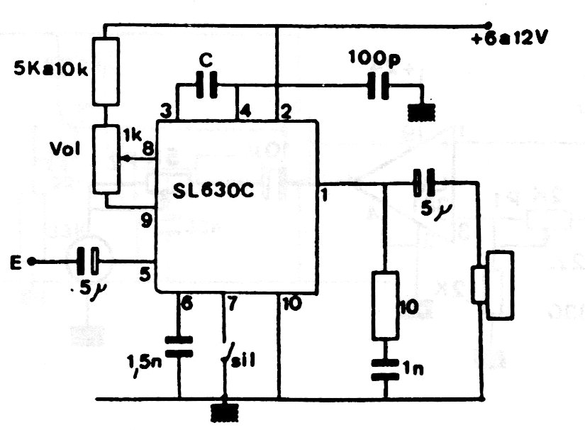 This circuit uses an integrated hard to find today and the phone must be of high impedance. We found this circuit in a European publication from the 1980s. The capacitor determines the frequency response of the circuit, typically between 10 nF and 1 uF.