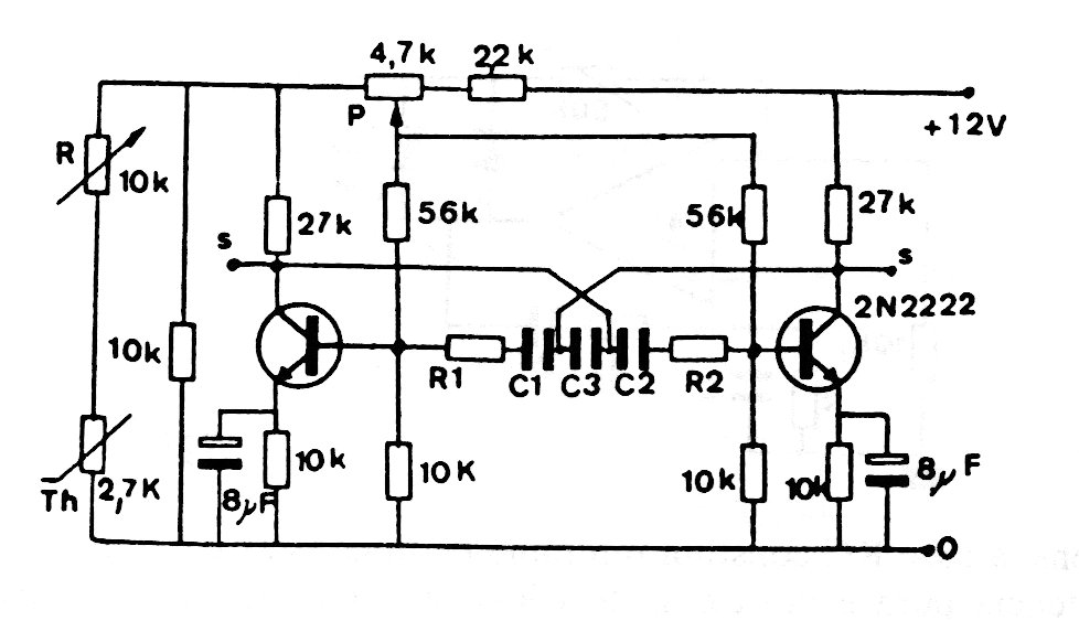 This astable was found in a European technical documentation from the 80's. The perfectly symmetrical unsaturated circuit has a generated frequency that depends on the capacitors C and the R setting. operation.