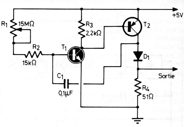This interesting transistor configuration, which can be seen elsewhere on this website and in this section, was found in a French documentation from the 1980s. The circuit uses general purpose transistors, and the capacitor determines the frequency and can have values between 10 nF and 10 uF typically. The potentiometer adjusts the frequency. The circuit can act as a shield.