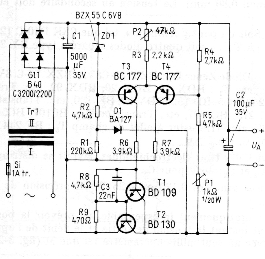 This variable power supply circuit was found in a German publication from the 1980s. The circuit is still viable and the most difficult to obtain transistors can be replaced by more common equivalents. The power transistor must have a good heat sink. The 22 V x 2 A transformer.