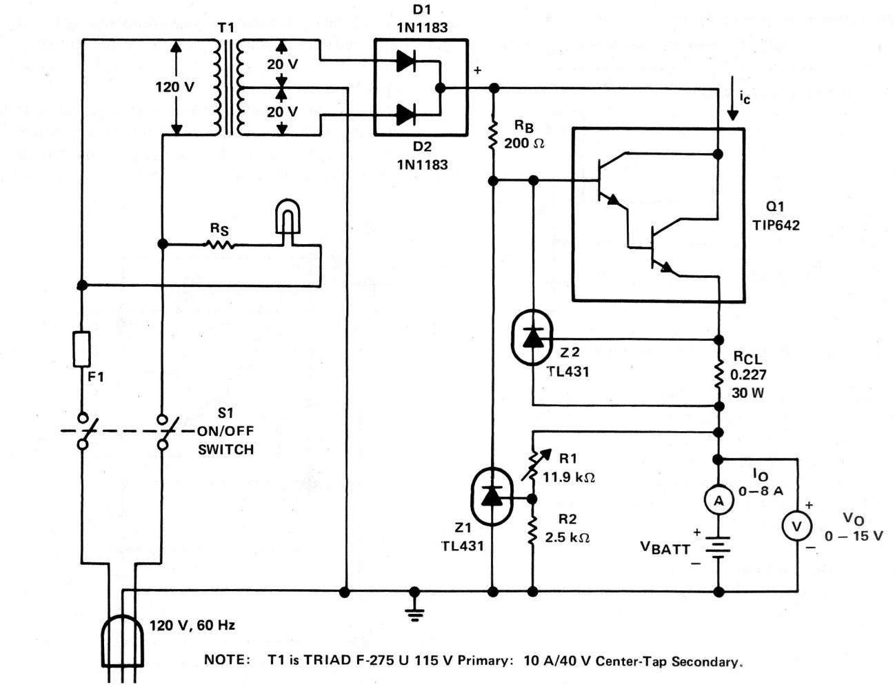 Some of the components used in this circuit are not very common today. The circuit is from a 1996 Texas Instruments linear applications manual. The circuit is suitable for charging automotive batteries and the maximum current is in the order of 10 A according to the instrument used. This must be the transformer secondary current.