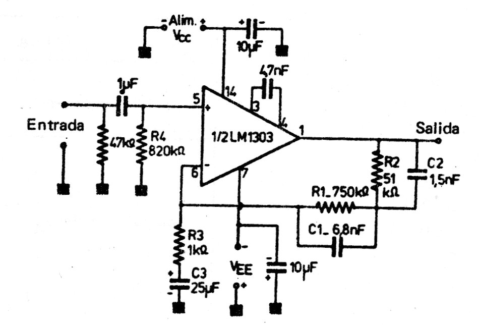 This circuit is from a 70s linear integrated manual. The integrated circuit used is uncommon today and one of the application's channels is shown. The power supply does not have to be symmetrical. We can find this configuration in other points of this site.
