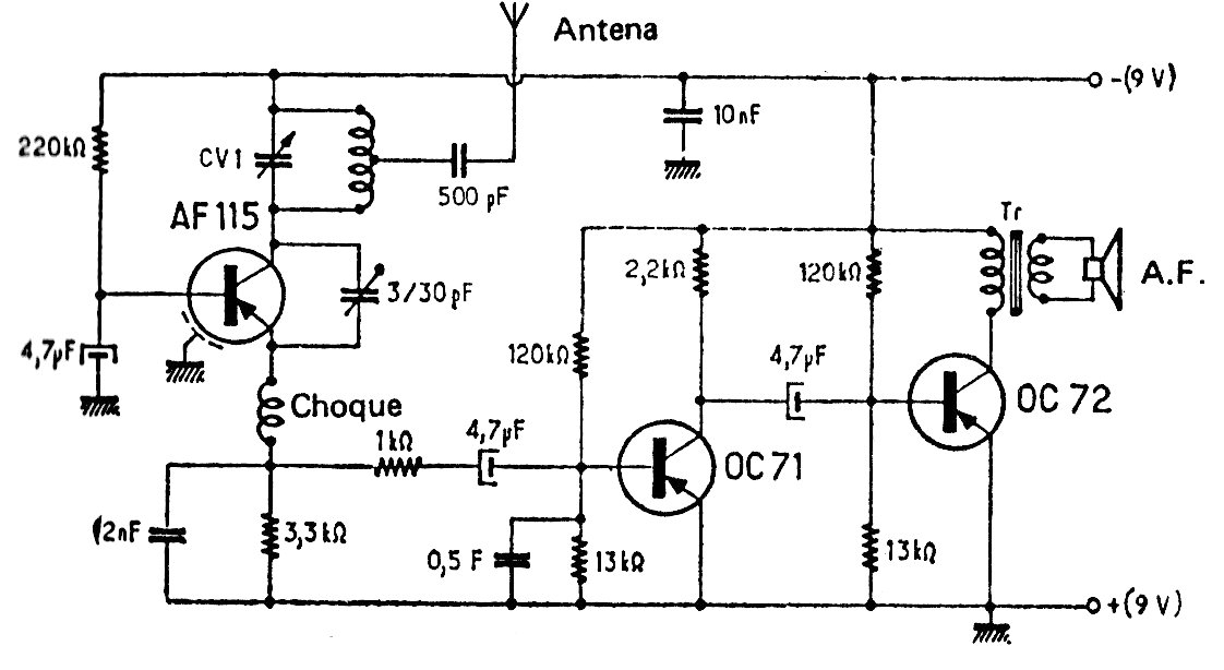 This VHF receiver with three transistors and loudspeaker listening was found in European documentation from the 1970s. The transformer is output to transistors and the coil of 3 to 7 turns of wire 26 or 28 in the form of 1 cm determines the range of tuned frequencies between 80 and 150 MHz.