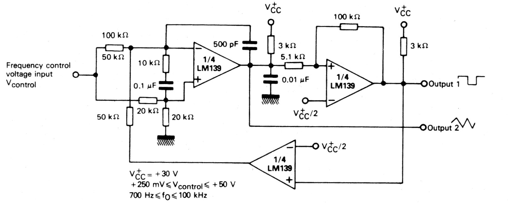 This voltage-controlled oscillator or VCO has rectangular and triangular signal outputs. The voltage comparator used is still common in our times, despite the circuit being an old documentation. The power supply does not have to be symmetrical and the characteristics of the circuit can be changed by changing capacitors.