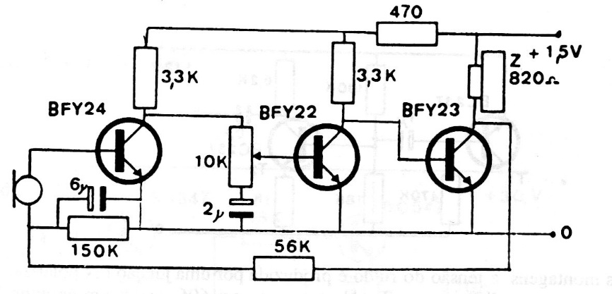 We found this amplifier for hearing aids or hearing aid using only transistors in a documentation from the 70s. The circuit can employ more common transistors such as the BC548 and the phone must be magnetic. The microphone is magnetic too. The feeding is done with a battery.