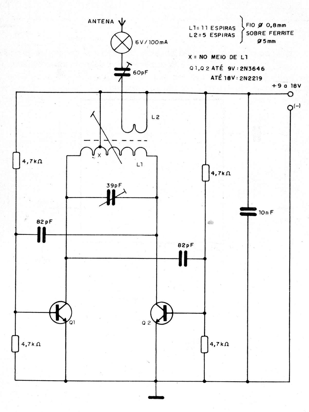This transmitter circuit for the 11-meter range was found in a 1990s spy book. The circuit supports equivalent types of transistors and is powered by voltages from 9 to 16 V. Details of the coils are given next to the diagram.