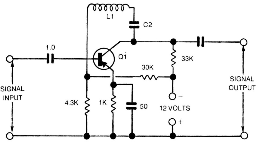 This LC step with only one general-purpose PNP transistor, was found in an American documentation from the 1980s. The rejected center frequency is determined by the LC circuit. The power supply, depending on the transistor, can be made with voltages from 6 to 12 V.