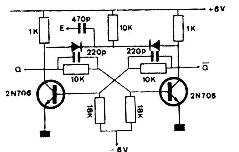 This conventional flip-flop configuration with two transistors was found in documentation from the 1980s. Transistor support equivalents.
