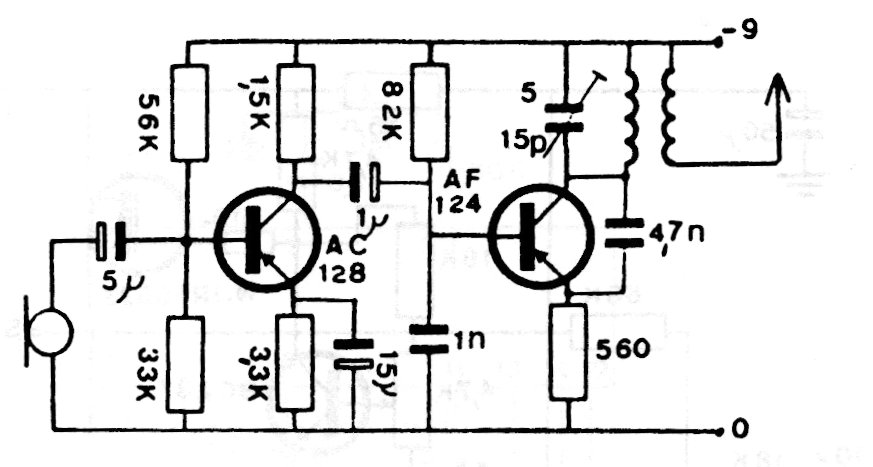 The coil of this transmitter has 4 coils of wire 26 or 28 in the form of 1 cm without core and on it the coil for two-coil antenna. The transistors can be the BF494 for RF and BC548 for audio. The circuit has a range of about 200 m with 9 V power supply and an antenna of 15 to 30 cm.