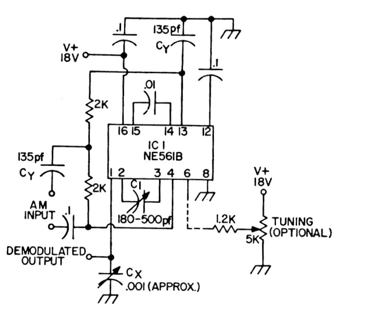 With this circuit it is possible to tune an AM signal using a 5k potentiometer (4k7). The circuit was found in a publication from the 1980s and the PLL can be replaced by an equivalent one, with tests.