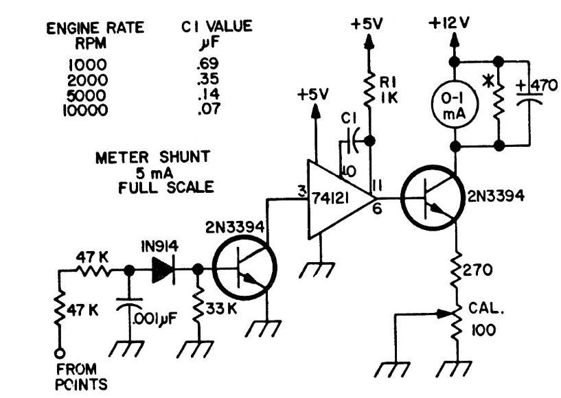 This 1975 tachometer for cars with platinum can serve as an idea for new projects. The components are from the era and a modern equivalent operational amplifier can be used.