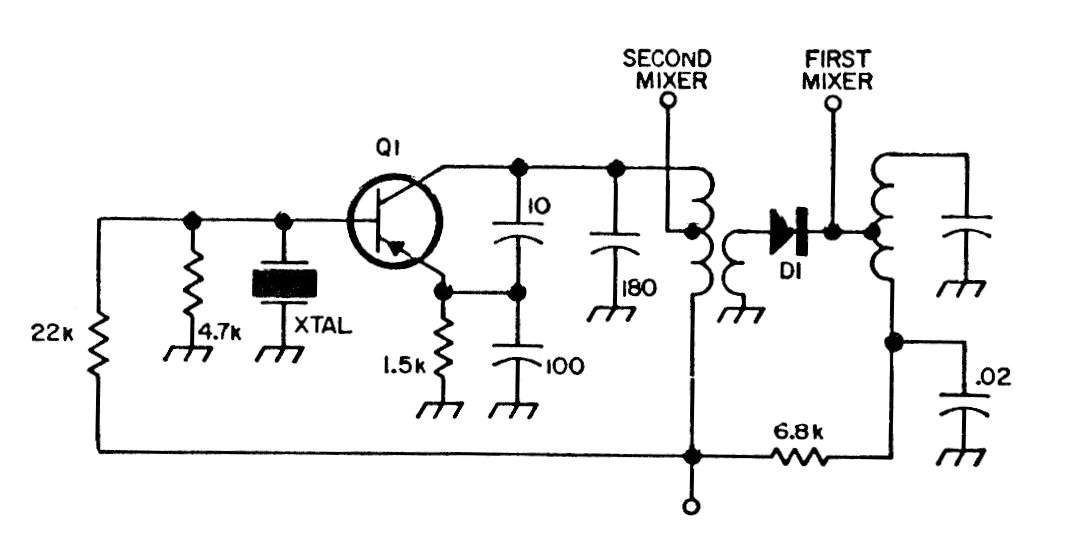 This circuit generates a signal for double conversion receivers. The signal has the frequency determined by the crystal. The transistor can be an RF PNP or even an NPN if the polarity of the supply is reversed.