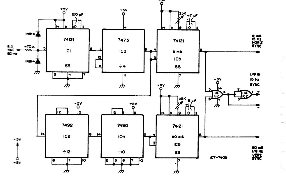 Originally this circuit was created to produce synchronism pulses in TV cameras SSTV (Low scan frequency), however it can be adapted for other purposes. The integrated circuits are common TTL.