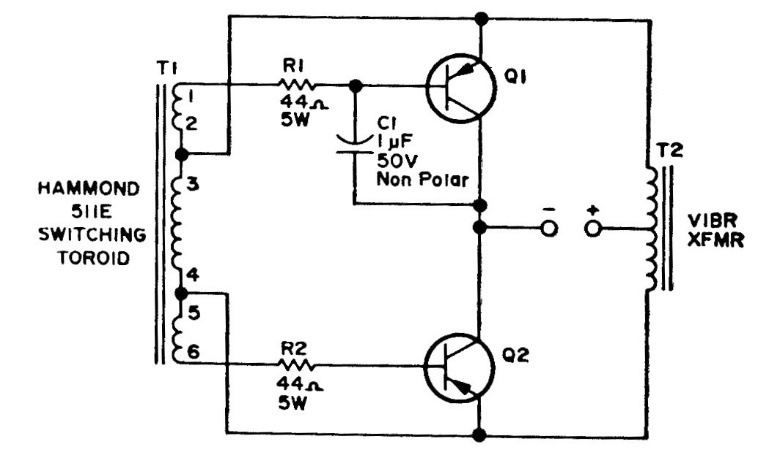 This 1975 circuit for automotive applications replaces the mechanical vibrator found in old cars to produce high voltage in the supply of tube equipment.