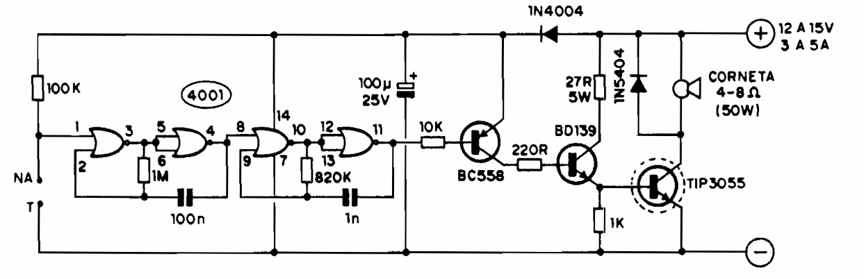 This powerful siren is suitable for warning or alarm systems. The components are current and the transistor 3055 must be mounted on a good heat sink.