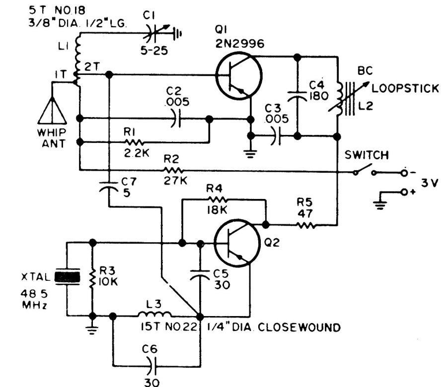 With this circuit it is possible to receive signals from the 150 MHz band on common AM radios for the medium wave band. The circuit is suggested by an American publication to hear signals from police vehicles.