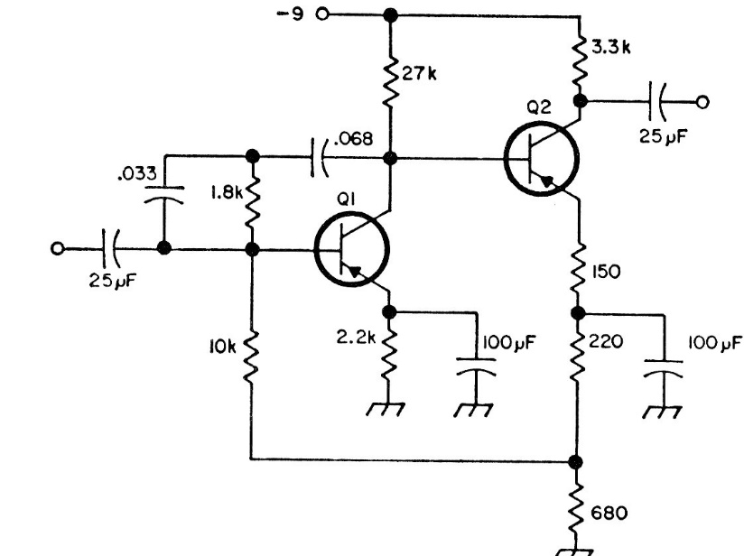 This configuration is from the 70s, having been found in an American documentation. The transistors can be BC549 for Q1 and BC548 for Q2.