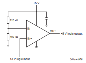 The voltage comparator used in this application is the NCX2220 from NXP. What this circuit does is transform a 3 V logic level signal into a 5 V logic level signal. The circuit can be used in an interface shield with TTL logic for microcontrollers.