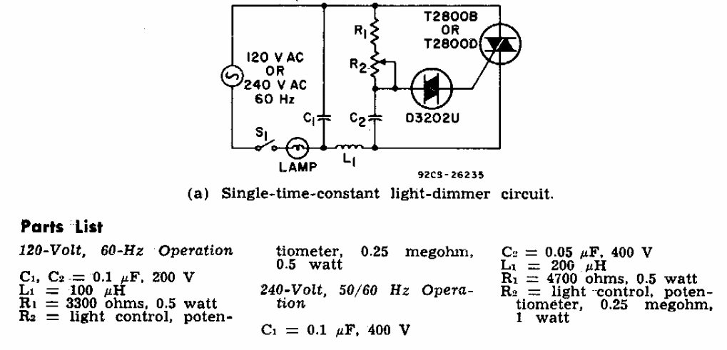 Found in documentation from the 1980s, this circuit is used for resistive loads (incandescent lamps). The triac must be equipped with a heat sink.