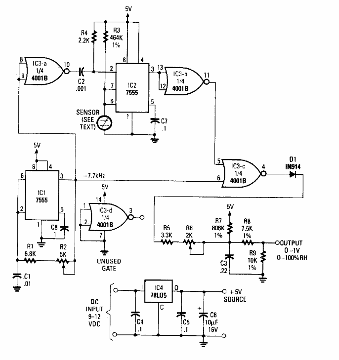 This circuit was found in Radio Electronics from the 90s. The sensor is an oscillator whose frequency depends on humidity, an uncommon component nowadays.