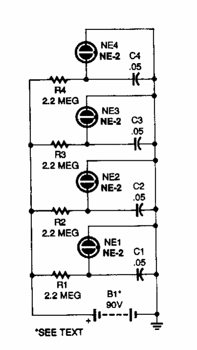 This simple expandable circuit was obtained from a Popular Electronics from the 80's. The supply voltage must be greater than 80 V.