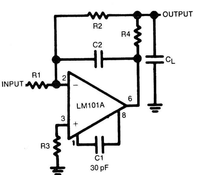 This circuit isolates capacitive loads of high values. We found this configuration in an application from the 70s, using an operational device of the time. More modern operating systems can be used, and the power supply must be symmetrical.