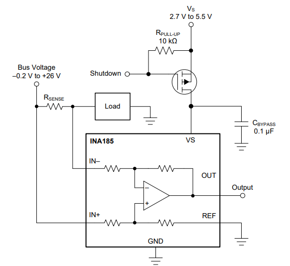 This circuit with the INA185 current sensor from Texas Instruments was obtained from its own datasheet (2019). The circuit features the shutdown feature and works with voltages from 2.7 to 5.5 V for current sensing.