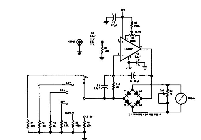 We found this circuit in an old publication. The components used are rare today. Accuracy depends on the resistors in the input selection network. The circuit operates from 10 to 500 kHz.