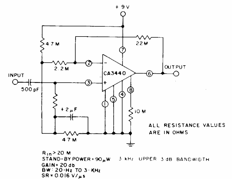 This high impedance amplifier is from 1985 documentation by General Electronic. The amplifier with FET at the entrance is from the period and the source is 9 V.