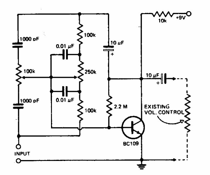 This circuit was found in an American documentation and can be added to common amplifiers of any type. The transistor can be any general purpose.