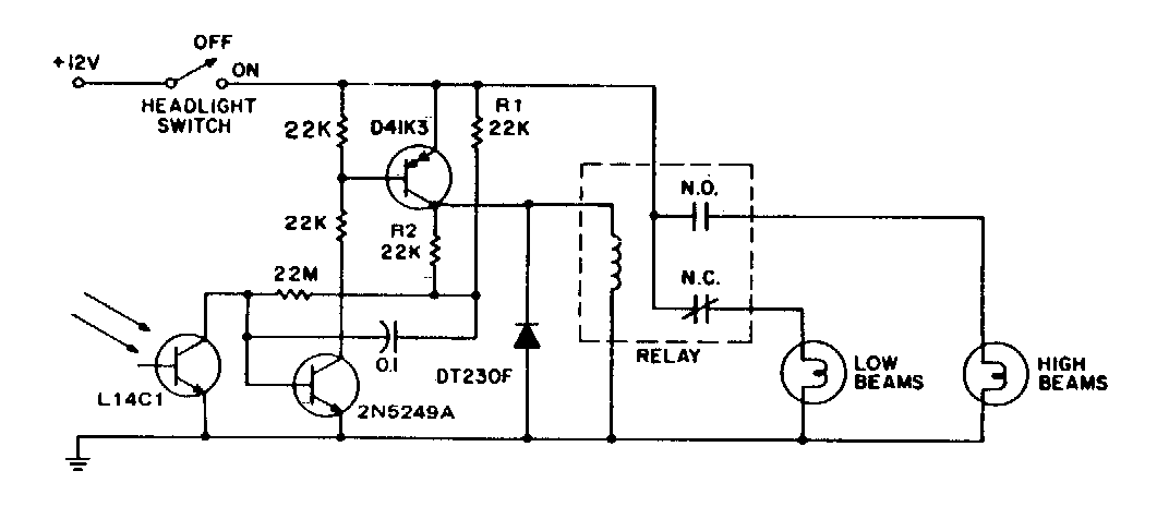 This circuit is from General Electric from the 80s, using a relay with high current contacts (20 A). The transistor admits equivalent, and any phototransistor can be used as a sensor.