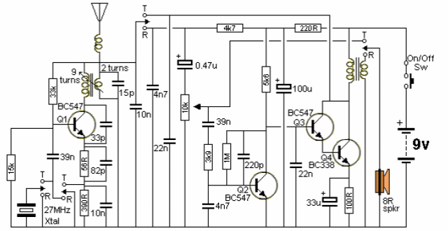 This intercom for the 27 MHz band was found in a recent English documentation, working with a battery of 9. The range is of the order of hundreds of meters in the open field and the crystals of the two devices of the pair must have the same frequency.