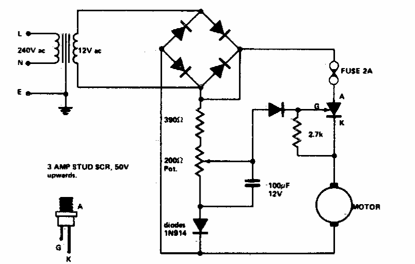 Found in old documentation, this circuit uses an SCR like the TIC106 that must be equipped with a heat sink. The motor can be up to 3A.