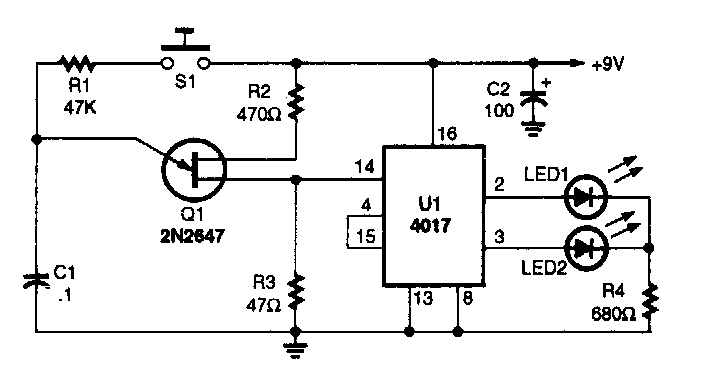 This game was found in an old Popular Electronics. The unijunction transistor can be 2N2646. The supply can be done with voltages from 6 to 12 V.