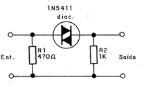 In this circuit, a load is fed only when the voltage reaches a certain value. Currents of up to a few tens of milliamps can be obtained at the output. The circuit also serves as a test of diacs, connecting a variable source to the input and a small load to the output. In parallel with the source, we connect a voltmeter to detect the trigger voltage.