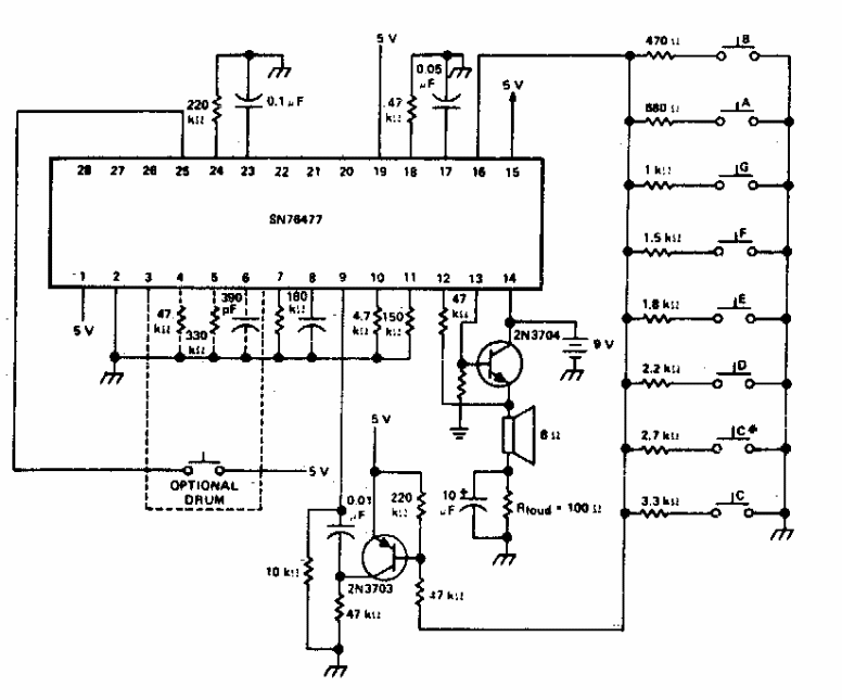 Found in documentation two years 80, this toy instrument uses an integrated circuit little commonly. As notes are given the values of key series resistors on the keyboard.