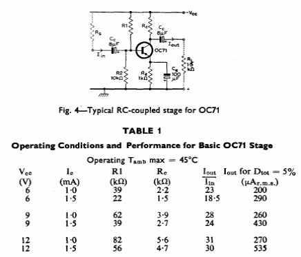 This basic circuit for a germanium transistor at the time was taken from a Mullard Manual from 1960. The values of bias resistors are power dependent.