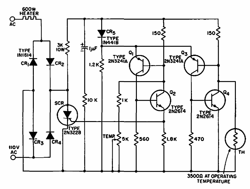 Found in old American documentation, this circuit is intended for the control of heating elements. The SCR must have current according to the controlled load. Transistors are from the time.