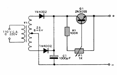 This power supply was originally indicated for work with electroplating. The transformer is 2 A or more. The transistor must have a heat sink.